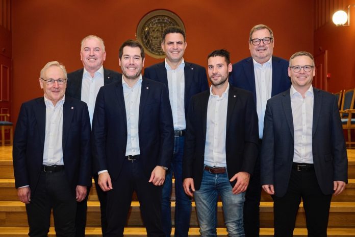 Foto: 26.11.2024; Generalversammlung FC Vaduz 2024. Der Vorstand von links: Lorenz Gassner, Christopher A. Holder, Patrick Burgmeier, Oezkan Gülbahar, Gabriel Meier, Norbert Biedermann und Benjamin Fischer. Auf dem Bild Feld Stephan Moosleithner. Bild: Michael Zanghellini