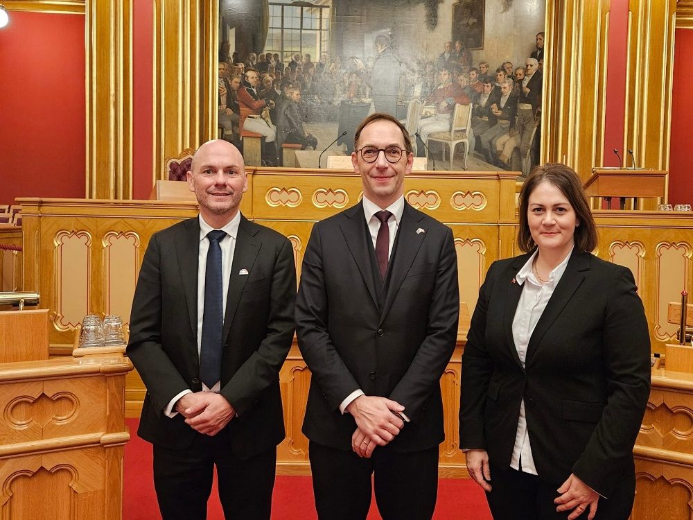 Auf dem Foto, von links: Der Stv. Abg. Hubert Büchel, der Abg. Daniel Seger (Delegationsleiter) und Jessica F. Bucher (Delegationssekretärin) im norwegischen Parlament in Oslo. IKR