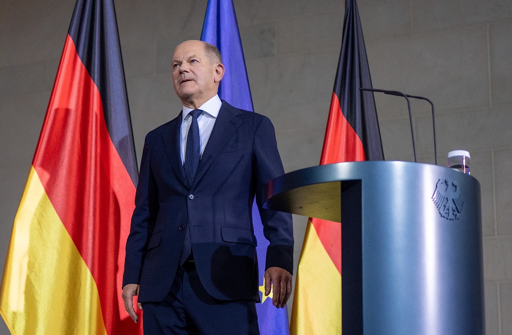 Der Deutsche Bundeskanzler Olaf Scholz nach seinem Statement über den Bruch der Koalition. Foto: Picture Alliance, Franlfurt/Main.