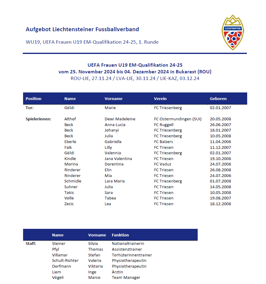 Liechtensteins Frauen U19-Nationalteam ist am Montag zum EM-Qualifikationsturnier nach Rumänien abgereist. Für die Spielerinnen stehen in den nächsten acht Tagen die Spiele gegen die Gastgeberinnen, Lettland und Kasachstan auf dem Programm.