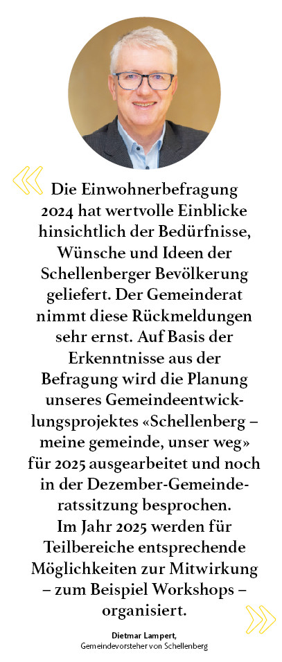 - Auf Basis der Erkenntnisse aus der Befragung wird die Planung unseres Gemeindeentwicklungsprojektes «Schellenberg – meine gemeinde, unser weg» für 2025 ausgearbeitet und noch in der Dezember-Gemeinderatssitzung besprochen.