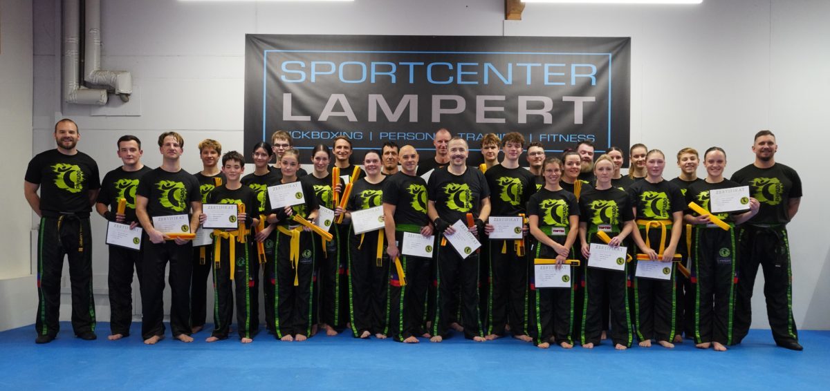 Knapp 60 Prüflinge stellten sich den Aufgaben zum nächst höheren Gürtel. Die Mehrheit absolvierte dabei den ersten bis dritten Gürtel, während Laura Kindle und Maxim Mamin mit dem GrünBlau-Gurt den höchsten Gurtgrad ablegten.