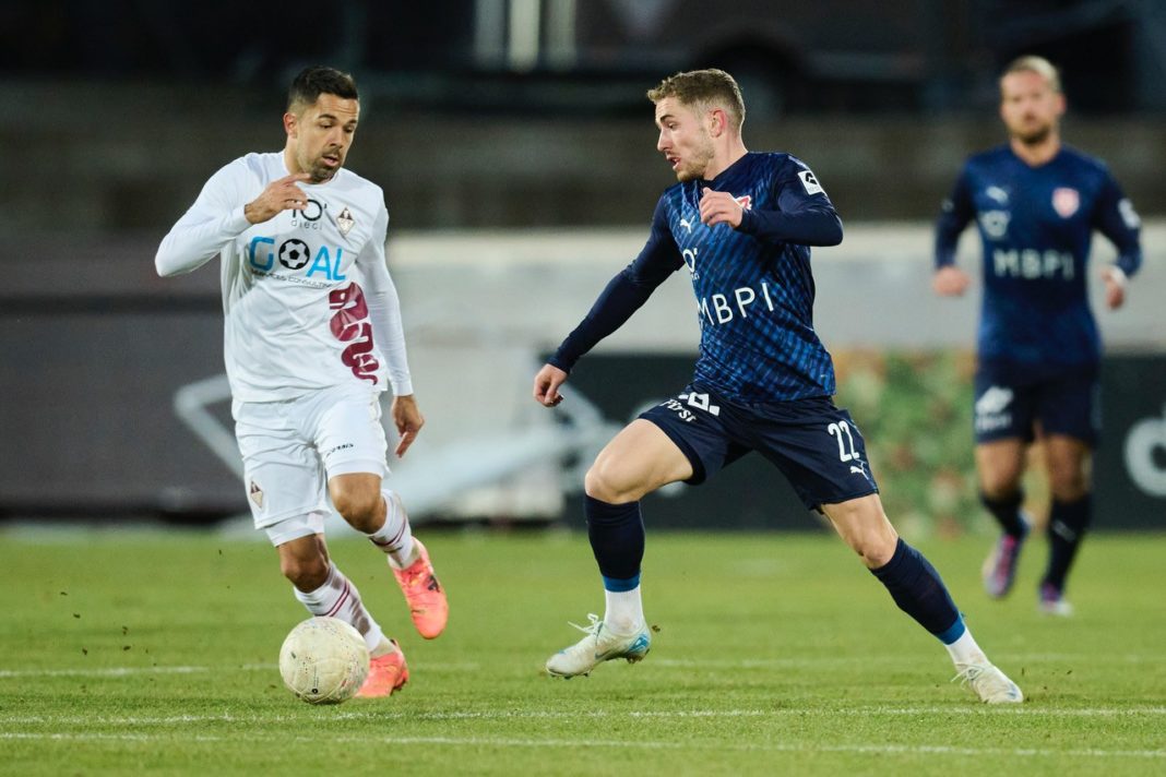 08.12.2024; Vaduz; Fussball Challenge League AC Bellinzona – FC Vaduz; Sebastian Gorga (Bellinzona) gegen Fabrizio Cavegn (Vaduz) (Michael Zanghellini)