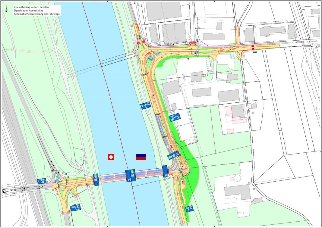 Konkret sieht das Projekt auf Liechtensteiner Seite einen Strassen- und Werkleitungsausbau von der Rheinbrücke über den Knoten der alten Holzrheinbrücke bis in die Zollstrasse Höhe Felbaweg vor. Die Spurausbauten sind notwendig, um alle Verkehrsbeziehungen weiterhin zu ermöglichen und um den Verkehr je nach Betriebsmodus auf die richtigen Fahrspuren zu leiten. Für den Verkehrsfluss und die Verkehrssicherheit sind entsprechend lange Verflechtungsstrecken zu gewährleisten.