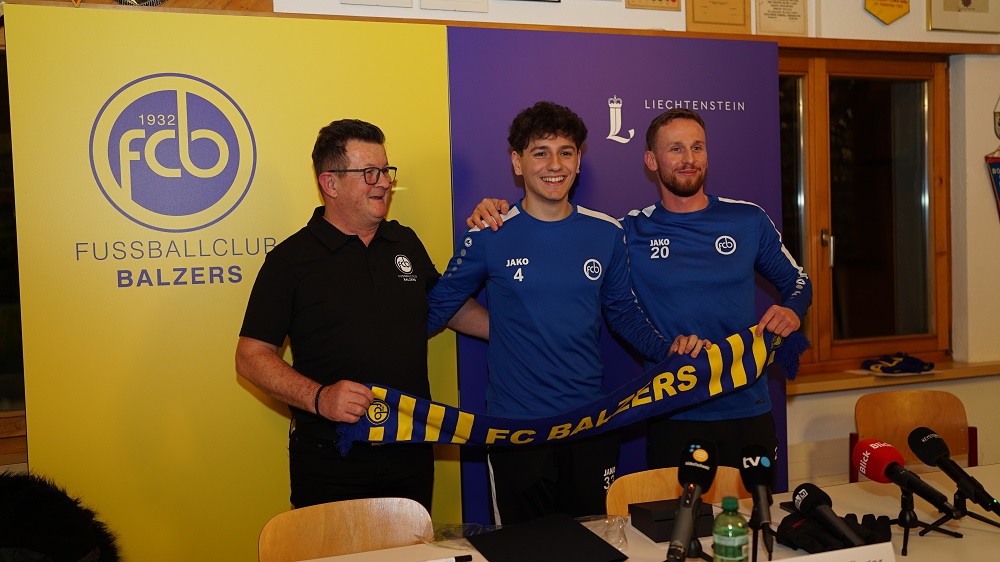 Bild: Der FC Balzers bei der Pressekonferenz mit dem argentinischen Social Media-Star Valentin Scarsini. Von links: FCB-Präsident Fredy Scherrer, "El Scarso" und Marketingchef Sandro Wolfinger vom FCB. Foto: Gregor Meier