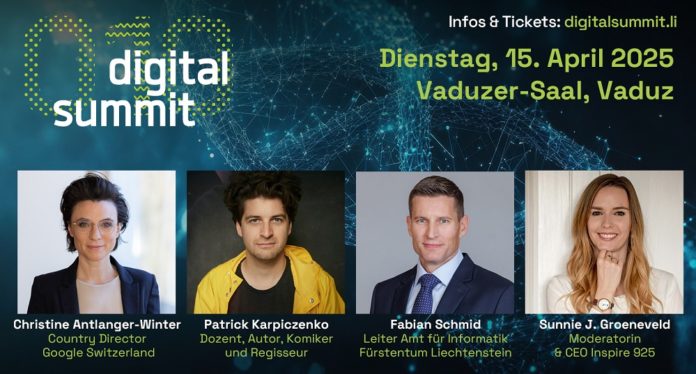 Der Digital Summit verwandelt am 15. April den Vaduzer-Saal erneut zum Dreh- und Angelpunkt der digitalen Transformation. An der führenden Digitalkonferenz der Region sprechen hochkarätige Expertinnen und Experten wie Google Schweiz Chefin Christine Antlanger-Winter, KI-Experte und Komiker Patrick Karpiczenko oder Fabian Schmid, neuer Leiter des Amts für Informatik über die Erfolgsfaktoren und die Bedeutung von Künstlicher Intelligenz (KI) für Wirtschaft und Gesellschaft.