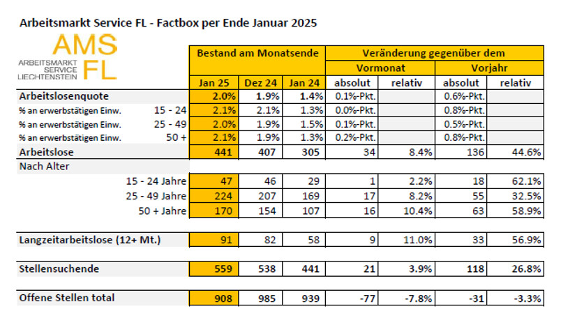 Beim Arbeitsmarkt Service Liechtenstein (AMS FL) waren Ende Januar 441 Personen arbeitslos gemeldet. Die Arbeitslosenquote erhöhte sich damit von 1,9 % im Dezember auf 2,0 % im Berichtsmonat.