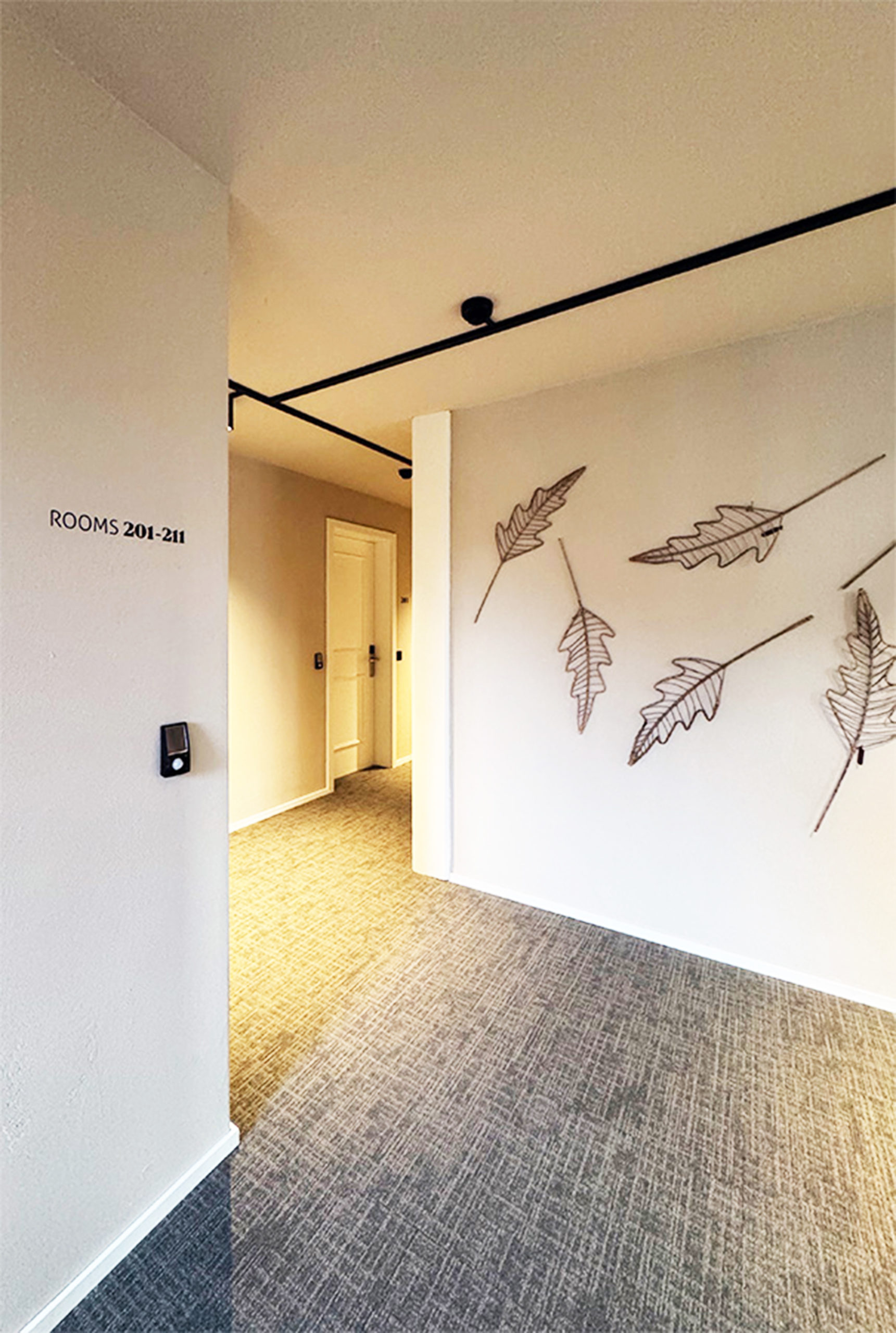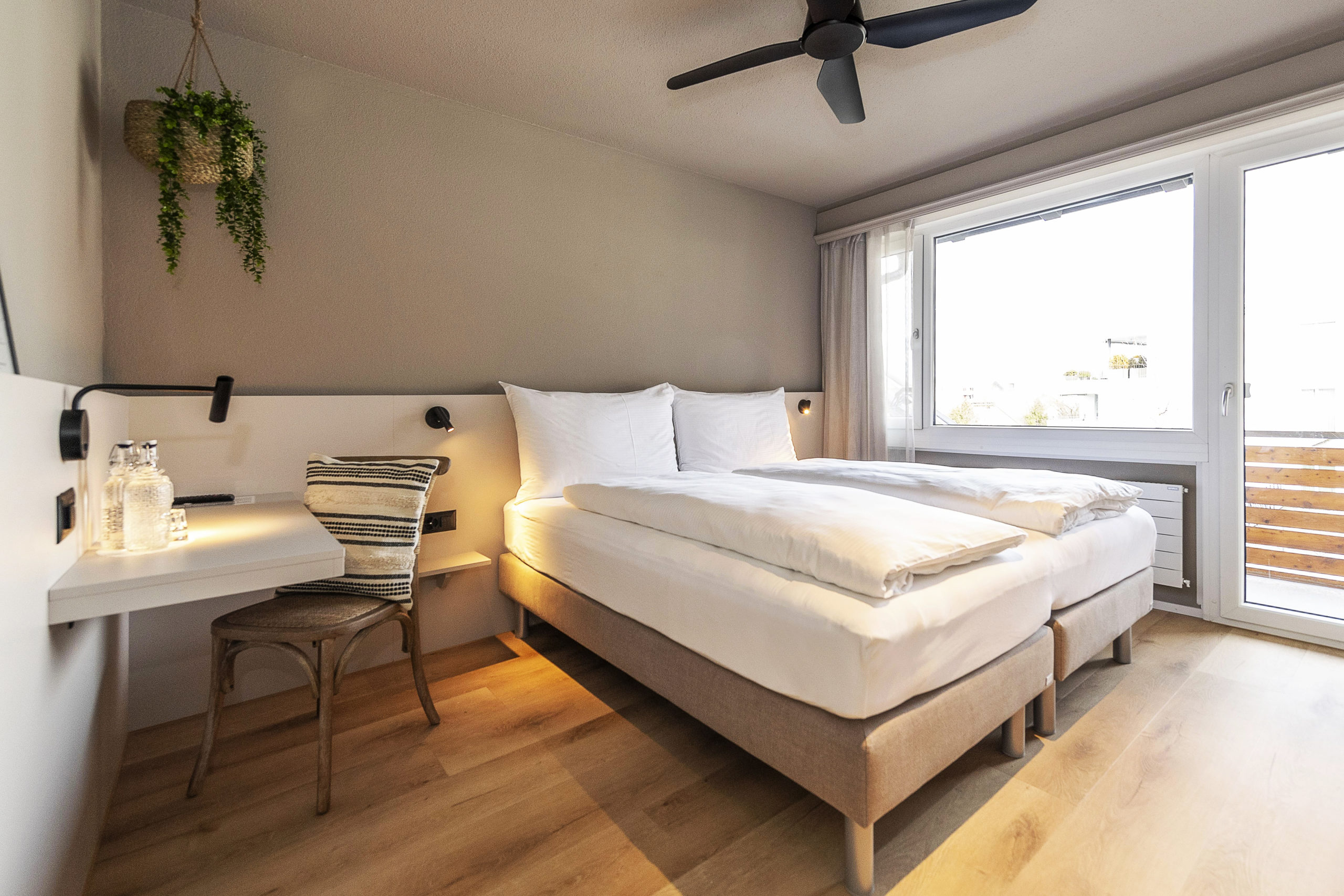 «Unsere Projektstudie sah vor, dass wir das alte, ans Hotel angebaute Wohnhaus aus dem Jahr 1922 durch einen Neubau ersetzen, der als Coffeehouse und Speisesaal für das Frühstück genutzt wird. Durch die Auflösung des Schwimmbads im Erdgeschoss des Hotels konnten wir ausserdem 70 Quadratmeter Raum gewinnen», sagt Sarah Hermann. Durch diese Massnahme liessen sich Lobby und Lounge im Empfangsbereich deutlich vergrössern. Die Gäste-WCs konnten aufgewertet und ein Sitzungs- beziehungsweise Seminarraum integriert werden. «Die Gebäudehülle haben wir komplett optimiert und energetisch genau wie die gesamte Haustechnik, die bereits 50 Jahre alt war, auf den neusten Stand gebracht. Zusammen mit der PV-Anlage auf dem Dach verfügt das Gebäude nun über deutlich mehr Energieeffizienz.» Die 22 Hotelzimmer wiederum haben eine umfassende Modernisierung erfahren. «Es ist uns mit vergleichsweise kleinem Aufwand, wie beispielsweise einem neuen Anstrich, neuen Möbeln und einer Sanierung der Bäder, gelungen, den Zimmern eine frische Optik und deutlich mehr Komfort zu verleihen», sagt Sarah Hermann.