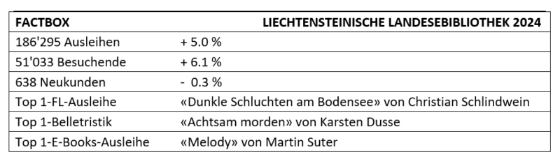 Im Jahr 2024 wurden insgesamt 186’295 Medien ausgeliehen, was einer Steigerung von 5.0 Prozent gegenüber dem Vorjahr (177’348 Ausleihen) entspricht. Dies ist ein neuer Rekord in der Geschichte der Landesbibliothek. Von den liechtensteinischen Publikationen wurde der Krimi «Dunkle Schluchten am Bodensee» des Balzner Pfarrers Christian Schlindwein am meisten ausgeliehen. Bei der Belletristik liegt «Achtsam morden» von Karsten Dusse an der Spitze, bei den E-Books hat «Melody» von Martin Suter die Nase vorn.