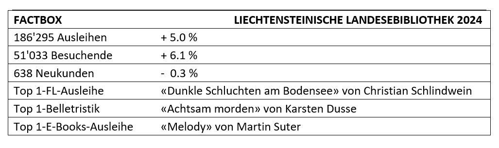 Die Liechtensteinische Landesbibliothek blickt auf ein äusserst erfolgreiches Jahr 2024 zurück. Sowohl bei den Ausleihen als auch bei den Besucherzahlen erreichte die Bibliotheksnutzung historische Höchstwerte.
