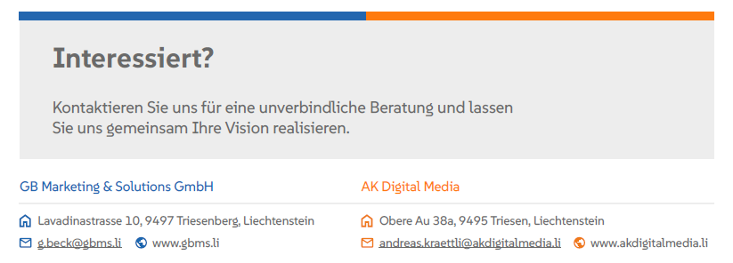 Triesenberg, Triesen – Die GB Marketing & Solutions GmbH und AK Digital Media haben eine Partnerschaft gestartet, um Unternehmen, Organisationen, Gemeinden, Vereinen und Veranstaltern in Liechtenstein und der Ostschweiz ein umfassendes Angebot in Marketing und Medienproduktion zu bieten.