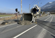 Auf einem Bahnübergang an der Industriestrasse in Schaan ist am Dienstag (19.02.2025) kurz vor 11.30 Uhr ein mit Beton beladener Dumper umgekippt.