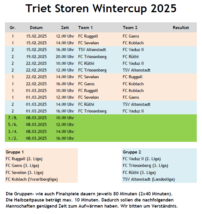 In zwei Vierergruppen werden an den nächsten drei Samstagen die Finalpaarungen ermittelt, welche am 8. März 2025 gespielt werden. Der FC Ruggell freut sich, dass auch dieses Jahr wieder Mannschaften aus Liechtenstein, der benachbarten Schweiz und dem nahen Vorarlberg dem Wintercup einen regionalen Charakter verleihen.