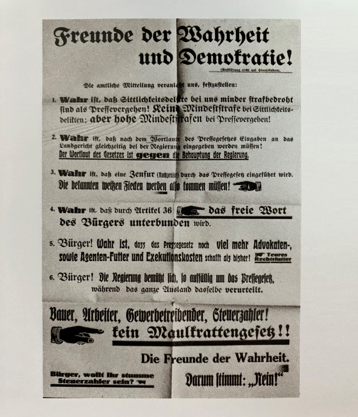 Schützenhilfe hatten Regierungschef und Landtagspräsident vom «Liechtensteiner Volksblatt» erhalten, das in einer Vorschau auf die Landtagssitzung auf die Verfassung verwies, die jeder Person das Recht einräume, in Wort, Schrift oder in bildlicher Darstellung seine Meinung frei zu äussern. Allerdings lege die Verfassung auch fest, die freie Meinungsäusserung habe «innerhalb der Schranken des Gesetzes» zu erfolgen. Das bedeute jedoch, «dass diese Freiheit nicht eine ungezügelte sein soll, sondern dass der Staat in der Gesetzgebung Mittel hat, die Auswüchse der Presse zu bekämpfen».