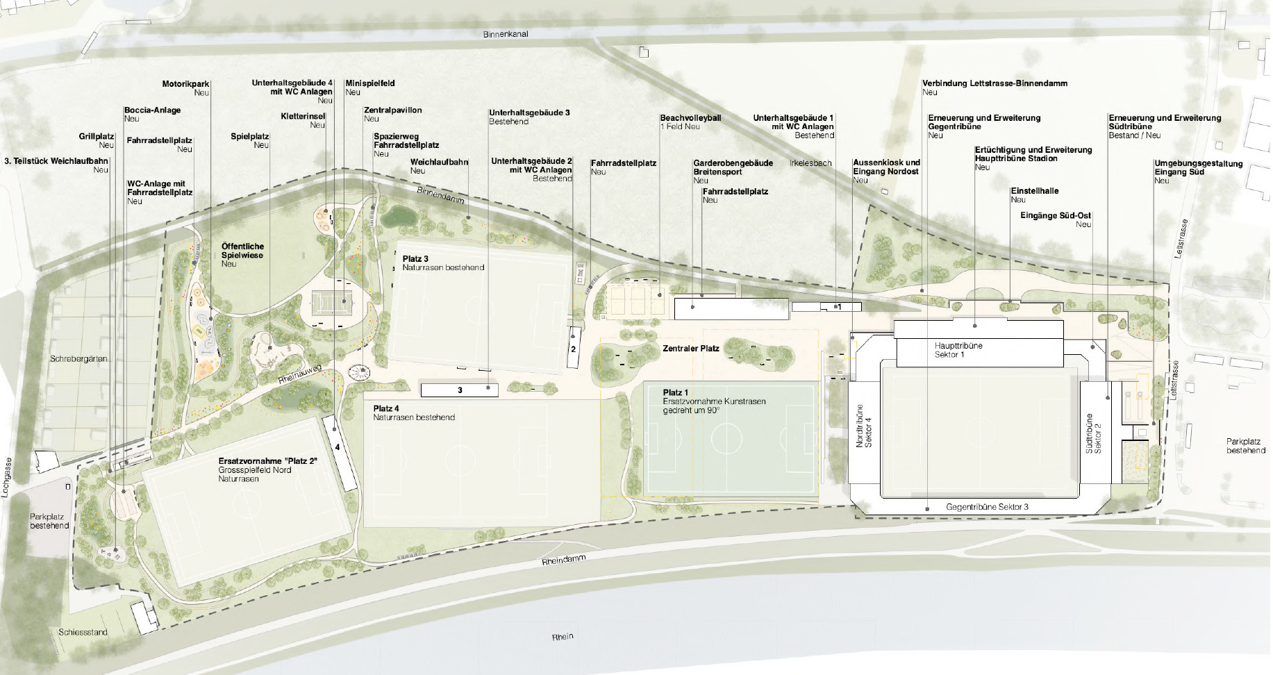 - Etappe B (2026 bis 2028): Neues Garderobengebäude für Breitensport, Erweiterung Beachvolleyball-Anlage um ein Normfeld, neuer Aussenkiosk für Breiten- und Spitzensportanlässe, Spiel- und Sportwiese, neuer Motorikpark, Parkgestaltung (Erneuerung Rheinauweg, Ausbau WC-Anlage und Fahrradstellplatz, neuer Pavillon)