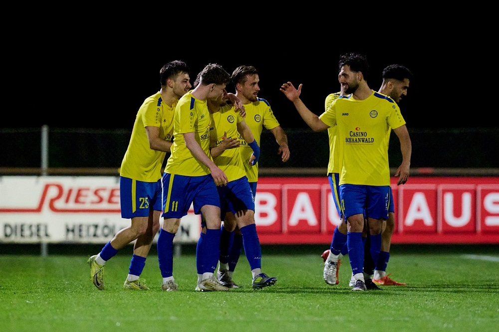 Jubel beim FC Balzers, der heute Abend Dardania SG mit 4:2 bezwang und zur Spitze aufgeschlossen hat. Jetzt können die Balzner aus eigener Kraft den 1. Liga-Aufstieg schaffen. Foto: Michael Zanghellini.