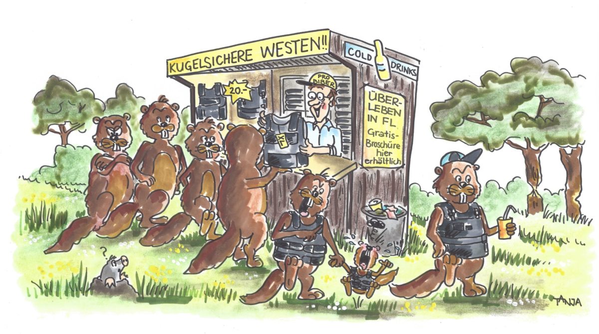 Wert legt Tanja Frick auch darauf, dass ihre Zeichnungen, für die sie je nach Anzahl der Gesichter sowie Details bis zu sechs Stunden benötigt, nicht beissend-spöttisch herüberkommen und niemanden verletzten, sondern dem Betrachter Freude machen und auch die Dargestellten darüber lachen können. Ein Beispiel dafür – wenn auch ohne dargestellte Personen – ist die erste Karikatur, welche die Zeichnerin im «Volksblatt» veröffentlicht hat. Es ging um die Vermehrung des Bibers und dessen Abschuss, der damals zur Diskussion stand. Tanja Frick versetzte sich sozusagen in die Lage der Nagetiere und zeigte, wie sie sich schützen könnten. «Die Rückmeldungen waren sehr positiv, was sicher auch daran lag, dass ich zwar in Absprache mit der Redaktion ein aktuelles Thema aufgegriffen, aber niemanden persönlich angegriffen habe.» Tiere sind ohnehin wiederkehrender Bestandteil von Tanja Fricks Zeichnungen. Die kleinen Mäuse, die jeweils ihren Kommentar zum Geschehen abgeben, waren beim «Biberkiosk» zwar noch keine Zaungäste, entwickelten sich aber bald darauf zu ihrem Markenzeichen. Heute sind sie aus ihren Zeichnungen nicht mehr wegzudenken. «Sie zieren auch die Rechnungen für meine Auftragsarbeiten. Dort kommentieren sie allerdings nicht, sondern bedanken sich», sagt Tanja Frick und lächelt.
