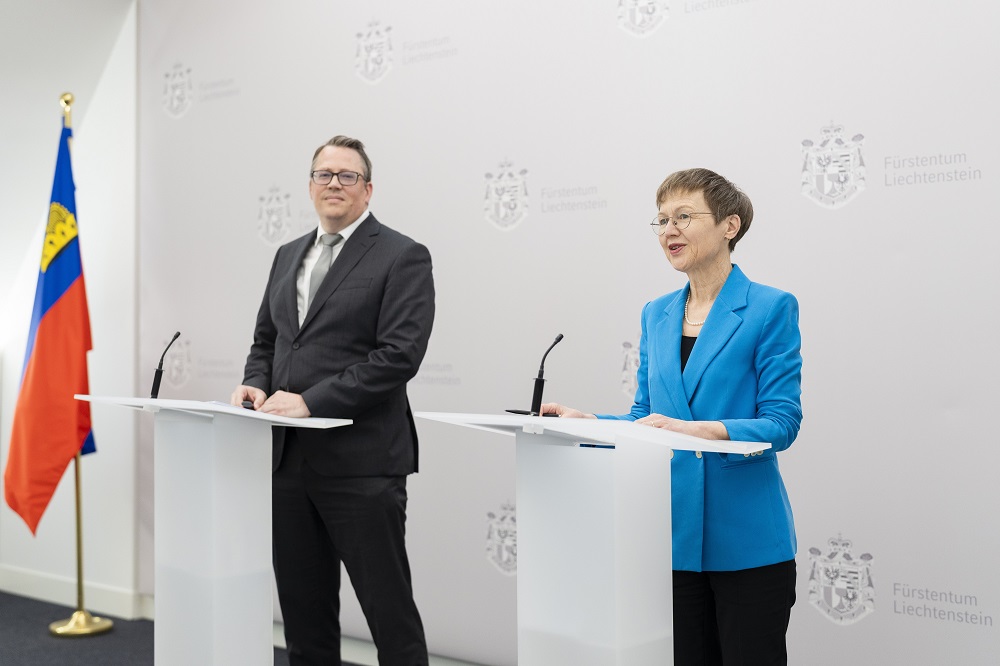 Andreas Gritsch, Leiter Amt für Finanzen und Regierungschefin Brigitte Haas präsentieren an der Medienorientierung die Landesrechnung 2024.