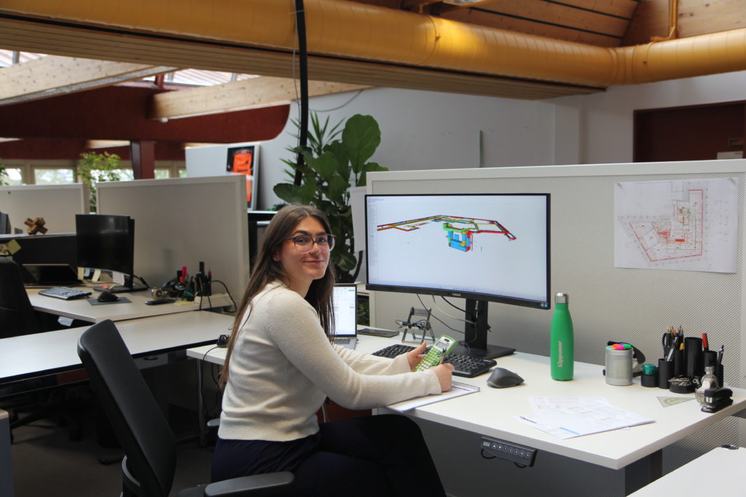 Das Erste, was ich am Arbeitsplatz erledige, ist die Bearbeitung der E-Mails. Danach arbeite ich an dem angefangenen Projekt weiter. Im Moment plane ich gerade ein Projekt mit Wohnungen und eines mit Büros. Es gibt jedoch noch ganz viele andere Gebäudearten, die wir planen, wie zum Beispiel einen Produktionsbetrieb, ein Labor, verschiedene Spitäler, Schwimmbäder und Restaurants. Als Gebäudetechnikplanerin in der Fachrichtung Lüftung zeichnet man üblicherweise Lüftungsanlagen. Natürlich zeichnet man sie nicht nur, sondern berechnet auch, wie schnell die Luft durch einen Kanal strömen kann oder wie gross ein Kanal überhaupt sein darf. Manchmal kann ich als Lernende mit meinem Praxisausbildner auf die Baustelle gehen. Es finden auch Sitzungen statt, bei denen man bespricht, wie es gerade auf der Baustelle läuft. Und vor der Montage der Teile werden die Pläne besprochen, damit es auf der Baustelle keine Probleme gibt und unsere Leitungen so durchfahren können, wie geplant. Um Bauteile montieren zu können muss man die Bauteile zuerst bestellen. Auch das erledigen wir. Wir telefonieren und schreiben E-Mails. Wir beantworten aber auch Fragen zu Lüftungsanlagen. Natürlich gibt es noch verschiedene weitere Aufgaben, die jeder einzelne Lehrling zu erledigen hat.