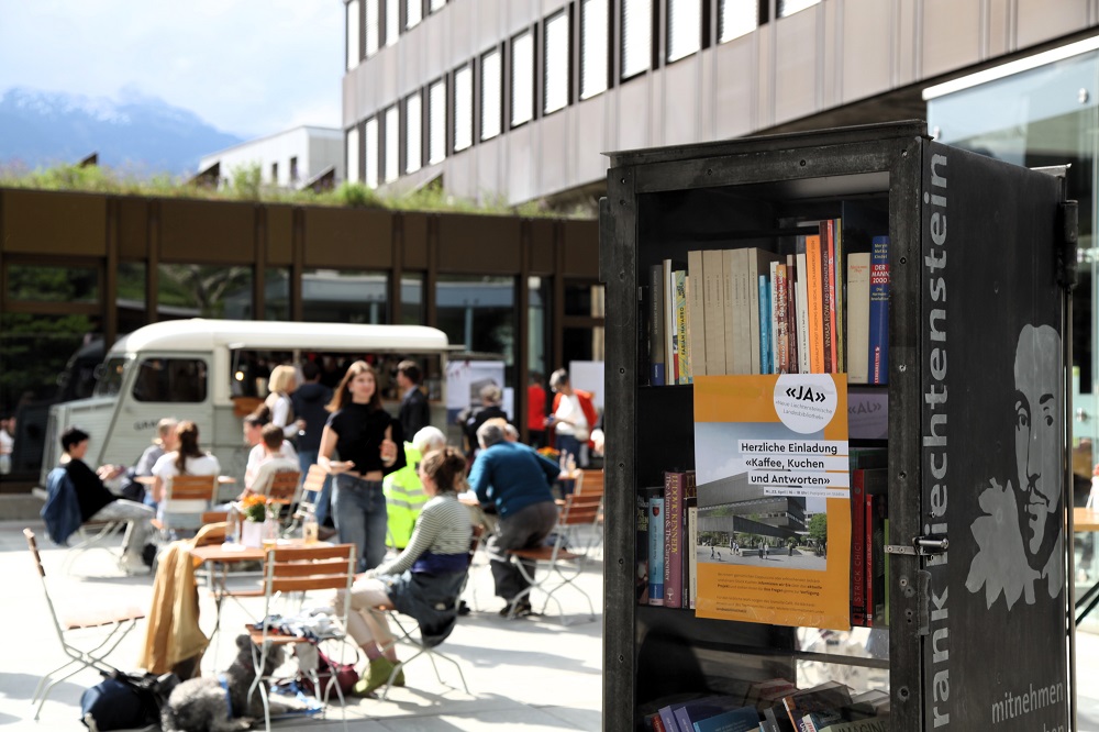 Zahlreiche Interessierte fanden den Weg auf den Postplatz in Vaduz, wo die Liechtensteinische Landesbibliothek zu «Kaffee, Kuchen und Antworten» eingeladen hatte. Bei schönem Wetter und entspannter Atmosphäre informierte das Team der Landesbibliothek über das geplante Umbauprojekt und stand den Besuchenden für Fragen und Antworten zur Verfügung.