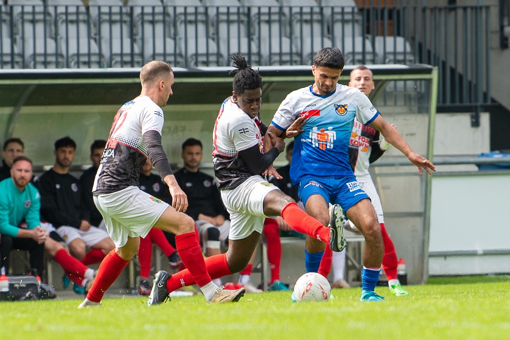 Sportpark, SO 27.4.2025: Der USV verliert 0:3 gegen Mendrisio. Im Bild rechts USV-Mittelfeldregisseur Josoah Daniel. Foto: Jürgen Posch
