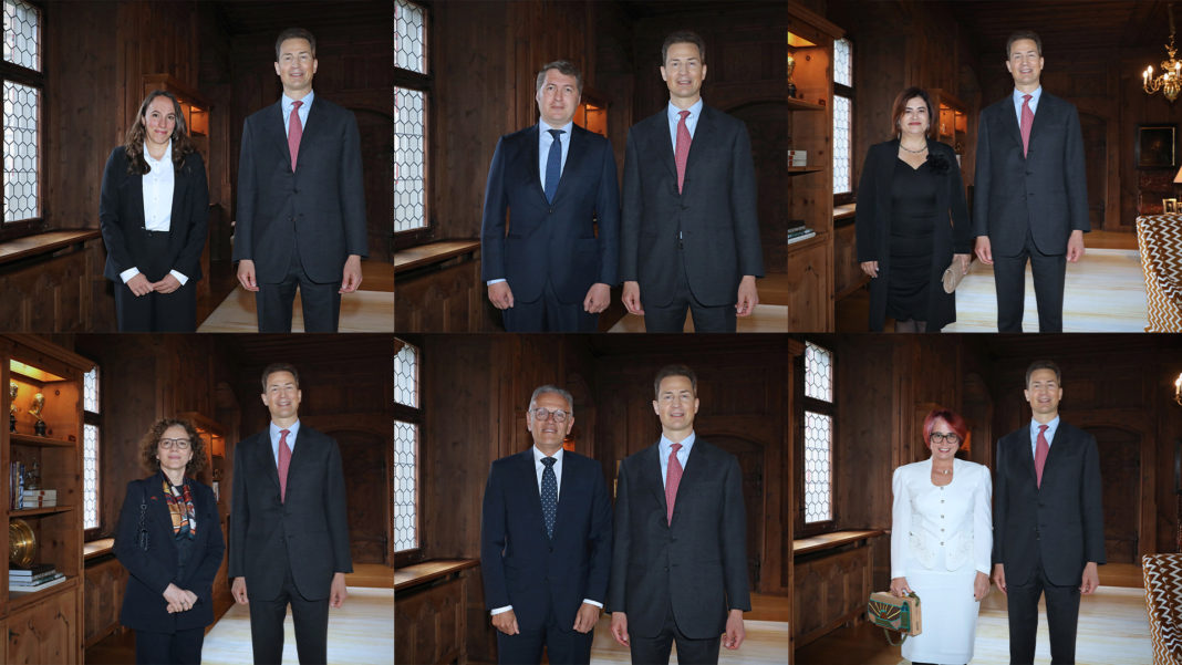 S. D. Erbprinz Alois von und zu Liechtenstein hat am Donnerstag, 8. Mai 2025, die folgenden sechs ausserordentlichen und bevollmächtigten Botschafterinnen und Botschafter zur Überreichung ihrer Beglaubigungsschreiben auf Schloss Vaduz empfangen: