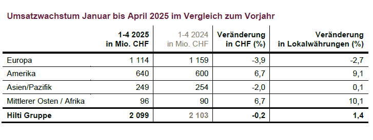 In den ersten vier Monaten – von Januar bis April 2025 – erzielte die Hilti Gruppe gegenüber dem Vorjahreszeitraum ein Wachstum von 1,4 Prozent in Lokalwährungen.
