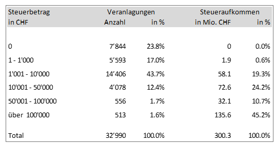 Wie sieht die Steuerlastverteilung bei der Vermögens- und Erwerbssteuer nach den effektiven Steuerbeträgen derzeit aus? Wie viele grundsätzlich Steuerpflichtige zahlen null Franken Steuern, wie viele bis CHF 1’000, bis CHF 5’000, bis CHF 10’000, bis CHF 50’000, bis CHF 100’000 und wie viele Steuerpflichtige bezahlen über CHF 100’000?