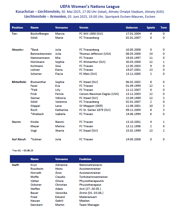 Die beiden Spiele auswärts in Kasachstan und im Sportpark Eschen-Mauren gegen Armenien markieren das Ende der ersten UEFA Women’s Nations League Kampagne des Liechtensteiner Frauen Nationalteams.