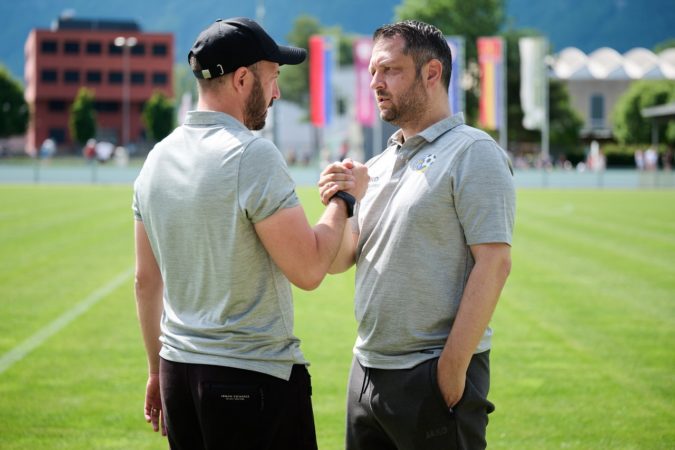 Links Trainer Vito Troisio (l.) des FC Ruggell bei der Begrüssung seines Trainerkollegen des FC Au-Berneck, Daniele Polverino, am 31.5.2025 in Ruggell. Foto: Michael Zanghellini