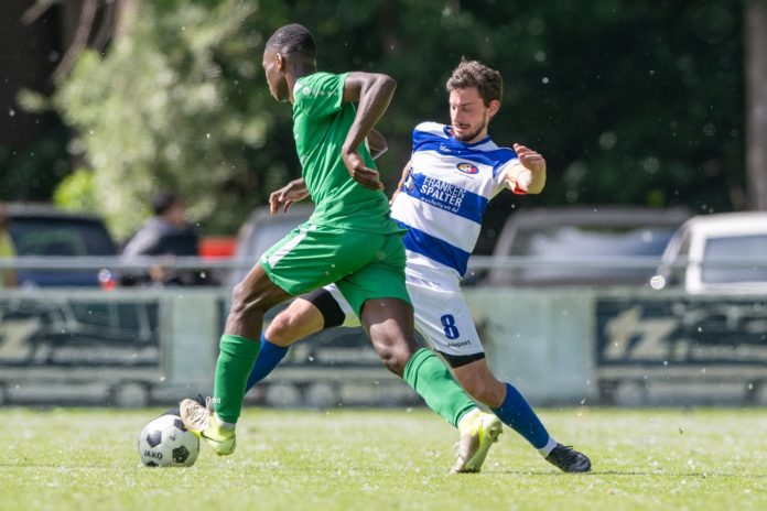 Szene vom heutigen Spiel Buchs-Schaan, das 3:3 zu Ende Ging. Im Bild rechts Schaans Captain Fabio Quaderer im Zweikampf. Foto: Jürgen Posch