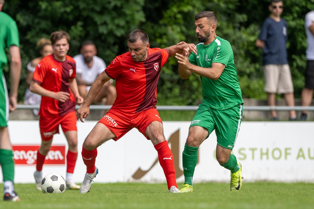 Sportanlage Rheinau, Buchs. 15. Juni 2025, Derby FC Buchs I - FC Vaduz II. Im Bild der Torschütze zum 0:1-Sieg für den FCV, der frühere Profi Milan Gajic (Bildmitte am Ball). Foto: Jürgen Posch