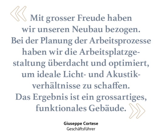 Die Arbeiten an der Fassade haben die Bauarbeiten zwar ein wenig verlängert. «Doch angesichts der Nutzung war uns diese Robustheit wichtig», sagt Bossi. Bedenke man, dass auch eine aufwendige Grundwasserabsenkung notwendig war, bevor mit dem eigentlichen Bau begonnen werden konnte, seien knappe zwei Jahre Bauzeit ohnehin eine beachtliche Leistung der beteiligten Unternehmen. «Dass wir dabei grossen Wert darauf gelegt haben, Firmen aus Liechtenstein und dem näheren Umkreis zu berücksichtigen, hat sich bewährt.» Dem kann Giuseppe Cortese nur beipflichten: «Wir haben seit dem Einzug im Januar alle viel Freude mit unserem neuen Arbeitsplatz. Das liegt mit Sicherheit nicht zuletzt daran, dass wir die Mitarbeitenden von Anfang an eng in die Planung eingebunden haben, sodass jeder seine Bedürfnisse äussern konnte. Unser Dank geht diesbezüglich an die ITW, die uns viele Freiheiten gelassen hat.»