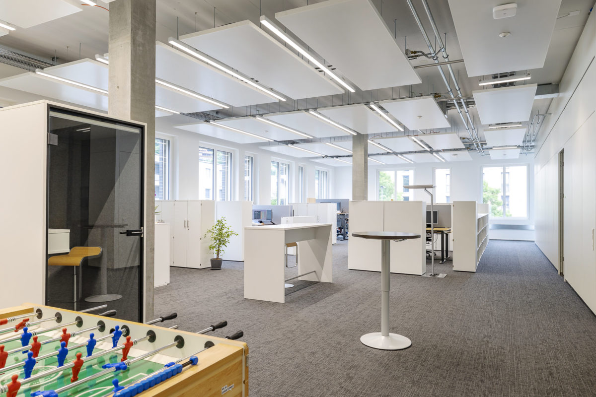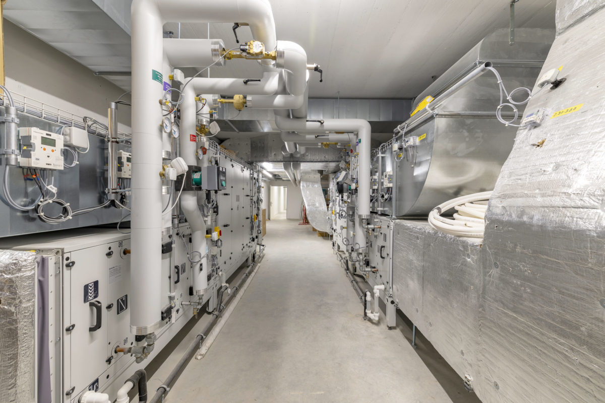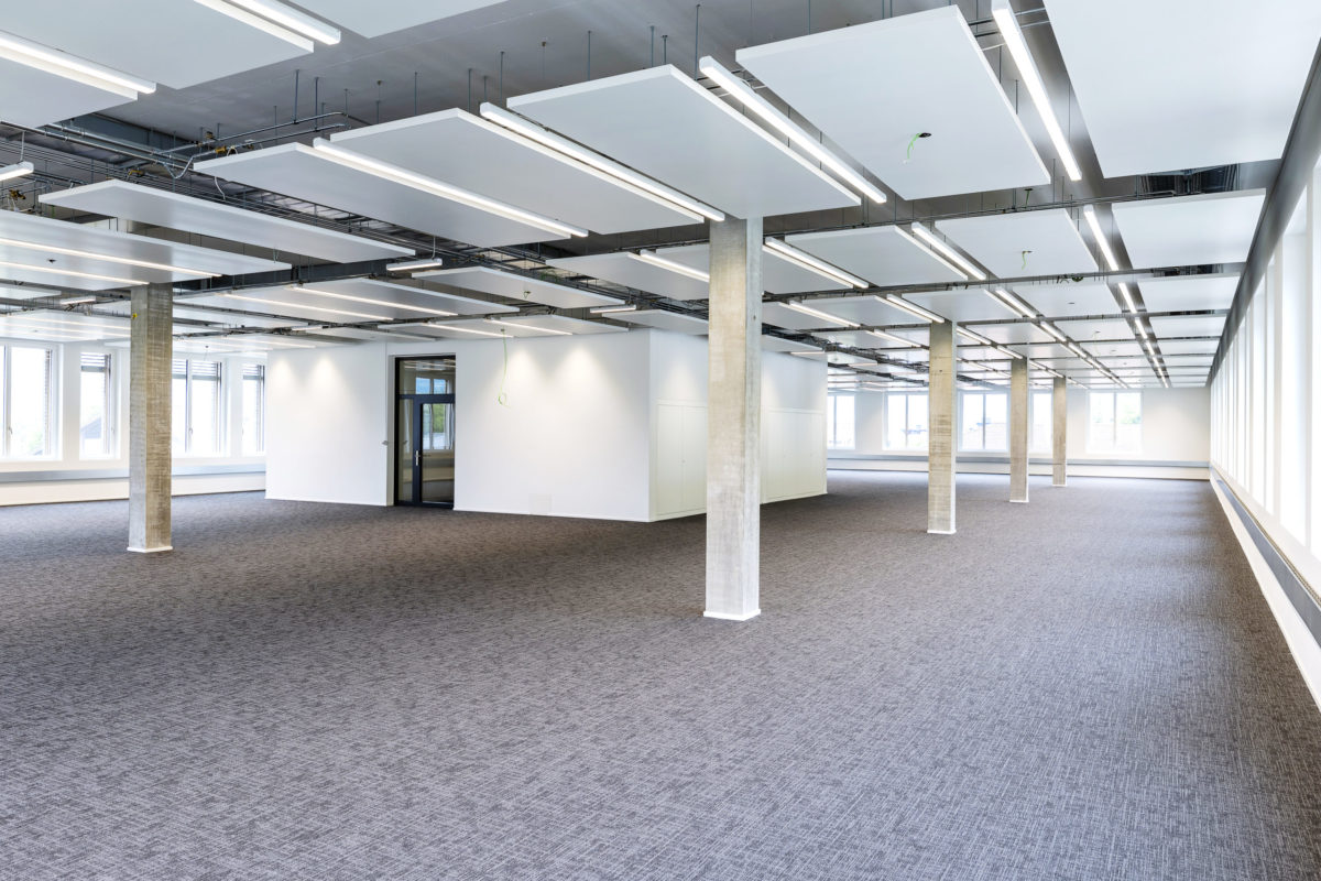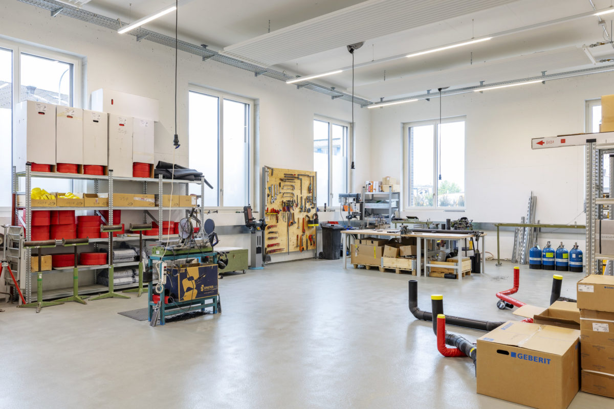 «Wir haben grossen Wert auf eine nachhaltige Energienutzung gelegt. Entstanden ist schliesslich ein Gebäude im Minergie-P-Standard», sagt Oliver Bossi. «Beispielsweise nutzen wir das Grundwasser zum Heizen wie zum Kühlen und speisen es anschliessend ins Netz ein. Zwei Nachbargebäude profitieren ebenfalls von dieser Lösung.» Giuseppe Cortese ergänzt: «Wichtig für die Aufenthalts- und damit Arbeitsqualität war uns neben der natürlichen sowie künstlichen Beleuchtung in Werkstatt wie Büros auch die Akustik. Direkt an der Hauptstrasse ist ein ausreichender Lärmschutz von grosser Bedeutung. Das konnten wir von aussen her durch entsprechende Fenster erreichen. Im Inneren sorgen Teppiche, Deckenpanele und Akustikwände für eine ruhige Atmosphäre.» Den Arbeitsabläufen überaus dienlich ist ausserdem die Tatsache, dass nun alle zusammengehörigen Arbeitsplätze bei der A. Vogt Gebäudetechnik AG jeweils auf einer Etage vereint sind.