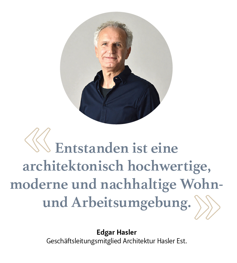In einer sehr guten Zusammenarbeit mit der Bauherrschaft, Projektleitung Oliver Bossi, sind zuerst die beiden Wohnanlagen und gleich im Anschluss das Gewerbe und Dienstleistungsgebäude über eine Bauzeit von vier Jahren realisiert worden. Die Herausforderungen, welche gemeistert werden mussten, insbesondere die Leistung des Bauleiters David Hasler und aller Handwerker und Unternehmer, war immens. Entstanden ist eine architektonisch hochwertige, moderne und nachhaltige Wohn- und Arbeitsumgebung.