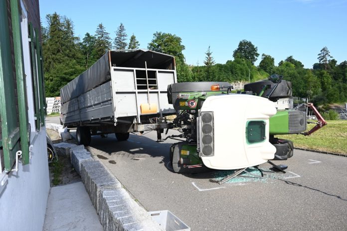 Ein 16-jähriger Mann fuhr mit seinem Traktor mit landwirtschaftlichem Anhänger auf der Mühlaustrasse von Bazenheid in Richtung Unterrindal. Auf der Thurbrücke musste der 26-Jährige selbstsagend einem entgegenkommenden, mittig fahrenden, Fahrzeug mit einem Fahrmanöver ausweichen. Dabei geriet die Fahrzeugkombination nach der Thurbrücke ins Schlingern. Infolgedessen gerieten sowohl Traktor als auch Anhänger auf Höhe Liegenschaft Mühlaustrasse 29 in der dortigen Linkskurve nach rechts und kollidierten mit mehreren Steinblöcken und einem Velounterstand. Durch die Kollision wurde der Traktor nach links abgewiesen und kippte zur Seite. Der 16-jährige Fahrer wurde durch den Unfall leicht verletzt. Er konnte noch vor Ort medizinisch versorgt werden. Am Traktor, den Steinblöcken und dem Velounterstand entstand Sachschaden im Wert von insgesamt rund 20’000 Franken.