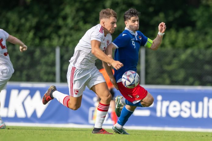 Die U21 Liechtenstein gewann das Testspiel am Samstag, 21.6.2025 im Sportpark gegen Gibraltar 3:1. Dreifacher Torschütze Luque-Notaro (r.) Foto: Jürgen Posch