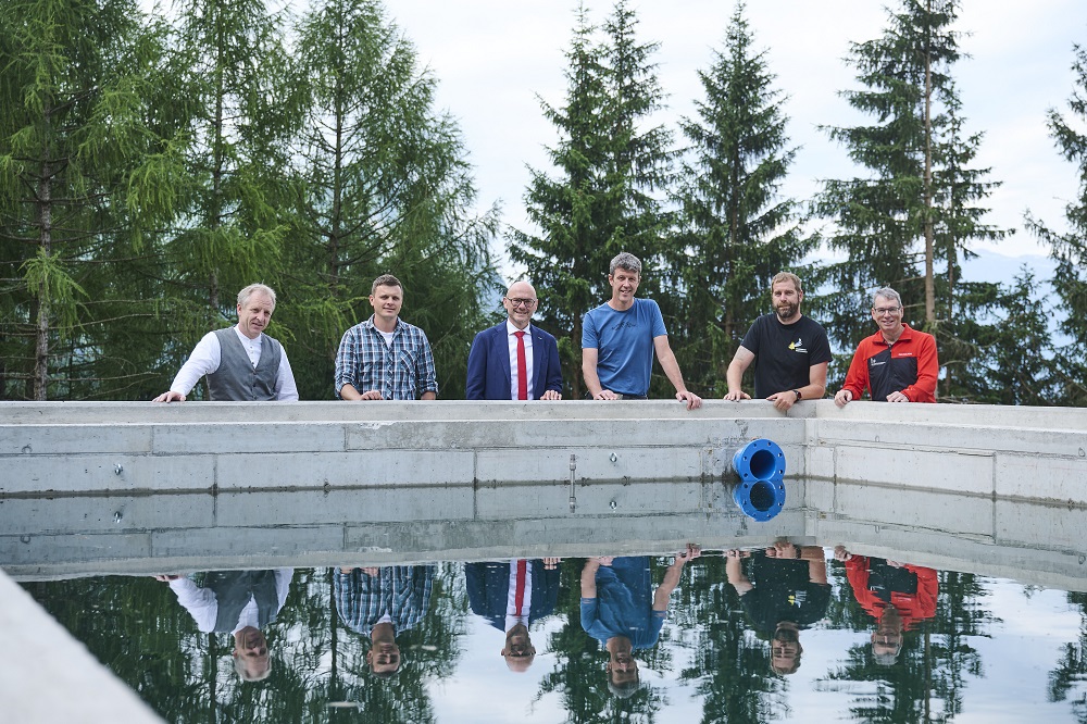 26.06.2025; Triesenberg; Medienorientierung - Löschwasserbecken für den Schutzwald. Von links: Christoph Beck, Vorsteher der Gemeinde Triesenberg, Daniel Oertig, Amt für Umwelt, Regierungsrat Hubert Büchel, Olav Beck, Förster Gemeinde Triesenberg, Florian Eberle, FW Kommandant Gemeinde Triesenberg und Günther Hoch, Amt für Bevölkerungsschutz (Foto: IKR/Michael Zanghellini)