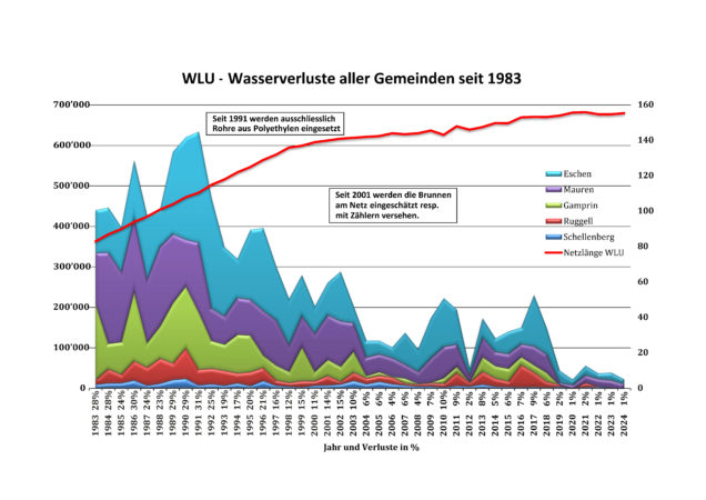 Die WLU ist stetig bemüht, die Wasserverluste klein zu halten. In den 90er-Jahren betrugen die Verluste um die 30 Prozent. Das heisst, dass 30 Prozent des geförderten Wassers nie beim Kunden ankamen. Seither ist es durch unentwegte Bemühungen gelungen, diese Verluste auch im Jahr 2024 zum sechsten Mal in Folge bei einem mustergültigen Wert von unter zwei Prozent zu halten. Am 13. August 2024 wurde ein unterdurchschnittlicher Höchstverbrauchstag mit 9’358 Kubikmetern verzeichnet. Der durchschnittliche Verbrauch pro Tag betrug 7’008 Kubikmeter. Die WLU hat im vergangenen Jahr 14’871 Personen bzw. 4’767 Haushalte jahraus jahrein mit bestem Trinkwasser versorgt, wovon der Anteil Grundwasser 48 Prozent und jener des Quellwassers 52 Prozent betrug.