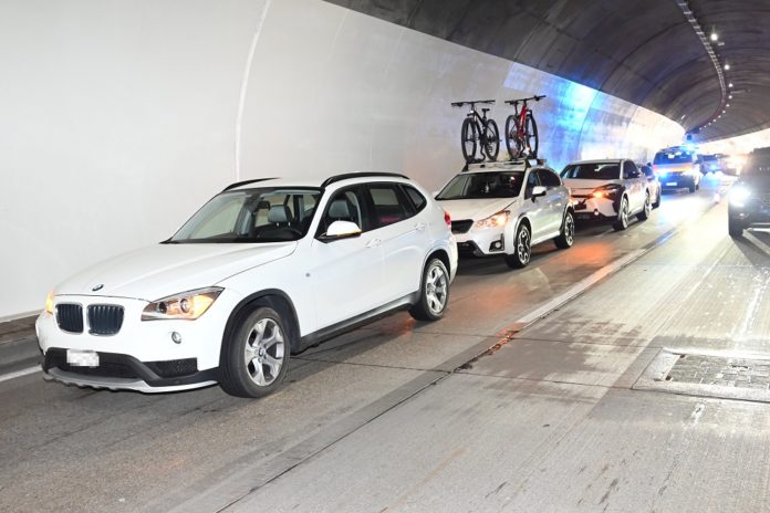 Eine 57-jährige Frau, eine 46-jährige Frau, ein 58-jähriger Mann und ein 45-jähriger Mann fuhren mit ihren Autos auf dem Überholstreifen der Autobahn A3 von Murg Richtung Flums. Im Tunnel Fratten bremste die 57-jährige Frau ihr Auto verkehrsbedingt stark ab. In der Folge kam es zwischen den Autos zu einer Auffahrkollision, in deren Verlauf alle vier Autos zusammenprallten. Es entstand Sachschaden im Wert von mehreren zehntausend Franken.