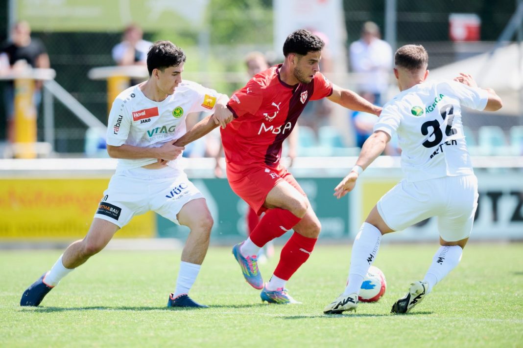 Ganz links Torschütze zum 1:0 gegen Kreuzlingen, Jonathan de Donno beim Dreierturnier am 12.7.2025 im Stadion Hafenareal in Kreuzlingen. Foto: Michel Zanghellini