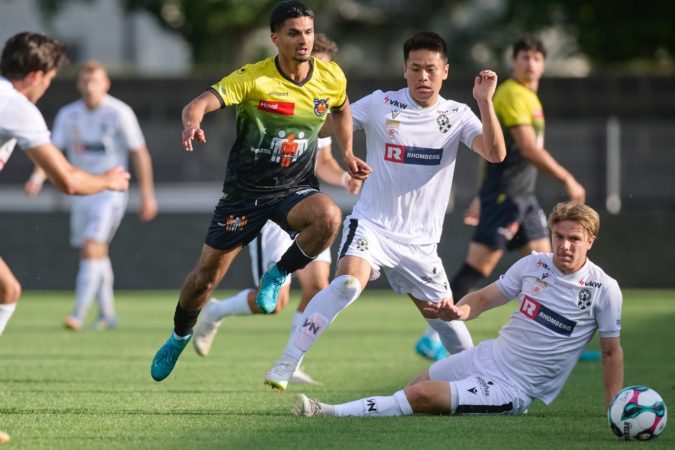 Bende Györky im Zweikampf mit ex-FCV-Spieler Simon Lüchinger (SW Bregenz). Foto: Michael Zanghellini