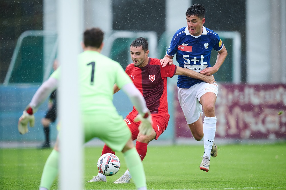 Widnau, 26.7.2025. Testspiel FC Widnau - FC Vaduz 1:0. Im Bild links (rotes Dress) Dylan Röck, FC Vaduz gegen Luca Beck, ex-FCV,neu FC Widnau. Foto: Michael Zanghellini