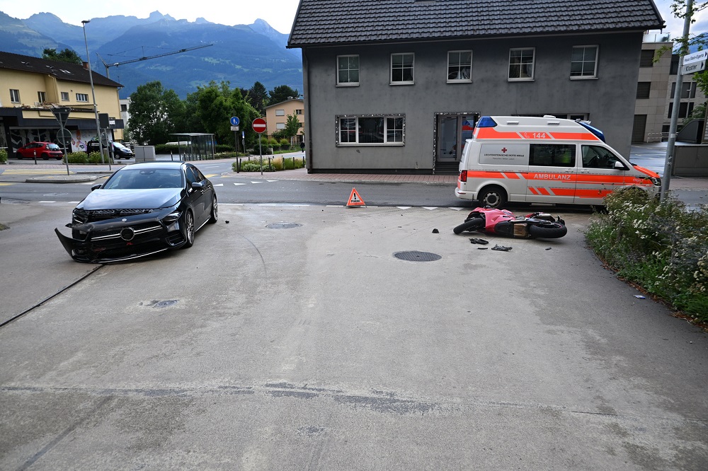 Gegen 19:30 Uhr fuhr ein Mann mit seinem Personenwagen auf der Wiesengass in Richtung Landstrasse, um dort links abzubiegen. Beim Einfahren in die Landstrasse, kollidierte er mit einer Motorradfahrerin, die in Richtung Schaan Zentrum unterwegs war. Die Frau zog sich eine Verletzung am linken Bein zu und wurde vom Rettungsdienst ins Spital gebracht.