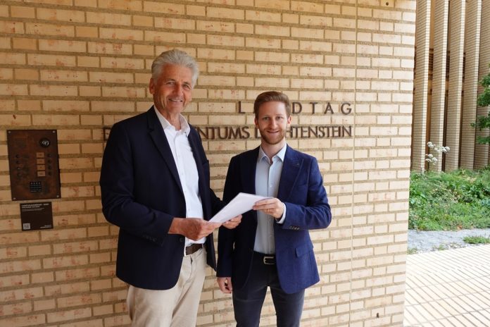 Daniel Salzgeber übergibt Josef Hilti vom Landtagssekretariat das FBP-Postulat.