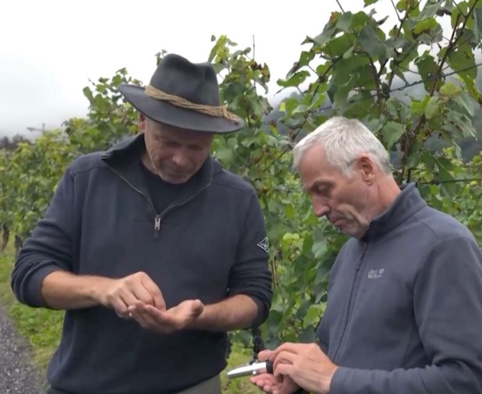 Im Bild analysieren der Kellermeister der Hofkellerei, Sebatian Gunsch zusammen mit Christoph Pirchl, Obmann der Genossenschaft, die Weinbeeren.