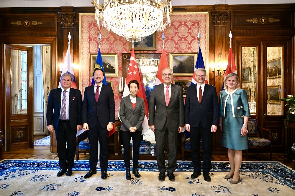 Kurt Jäger, EFTA Secretary-General, Frank Büchel, Ambassador of Liechtenstein to WTO and EFTA, Grace Fu Hai Yien, Minister-in-charge of Trade Relations of Singapore, Guy Parmelin, Bundesrat Schweiz, Einar Gunnarsson, Ambassador of Iceland, Permanent Representative to EFTA, the WTO and other International Organisations in Geneva, and Kjersti Rødsmoen, Ambassador of Norway to Switzerland in Bern / Weiterer Text über ots und www.presseportal.ch/de/nr/100000148 / IKR