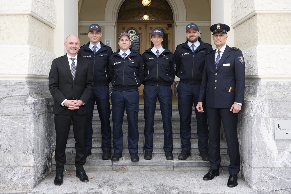 26.09.2025; Vaduz; Feierliche Aufnahme der Polizeiaspirantinnen und -aspiranten ins Polizeikorps mit Regierungsrat Hubert Büchel - Von links: Regierungsrat Hubert Büchel, Patrick Oehri, Samuel Jehle, Elena Näscher, Sandro Frick und Polizeichef Jules Hoch