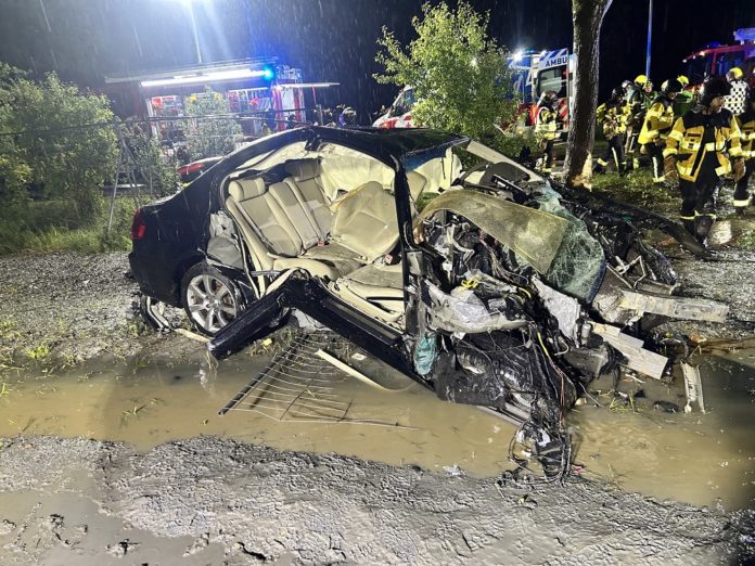 Durch den Aufprall wurden zwei Personen im Fahrzeug eingeklemmt. Sie wurden durch die alarmierten Einsatzkräfte aus dem Auto befreit.