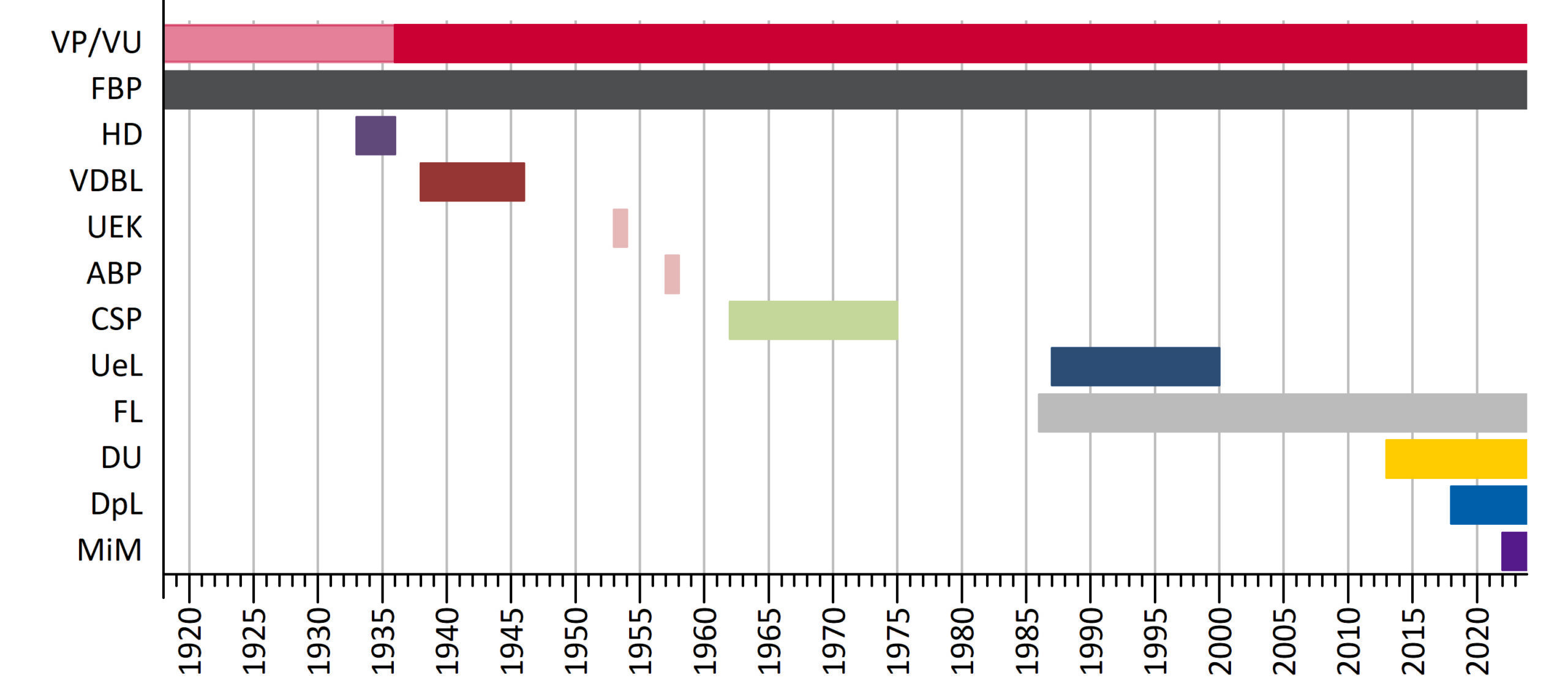 Viele Jahrzehnte dominierten zwei Parteien die Politik in Liechtenstein: die Fortschrittliche Bürgerpartei und die Vaterländische Union. Doch seit den 1980er-Jahren weitet sich das Parteienspektrum aus.